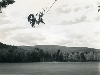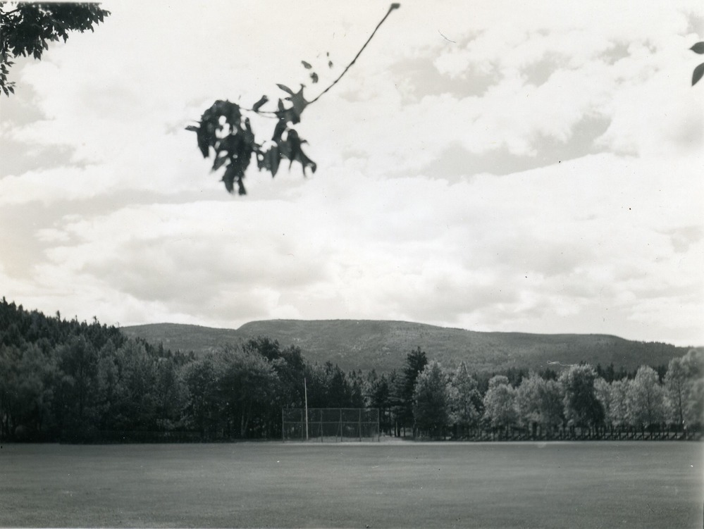 VIEW OF CADILLAC MT. FROM PARK HEADQUARTERS. A BASEBALL FIELD IS IN THE FOREGROUND.