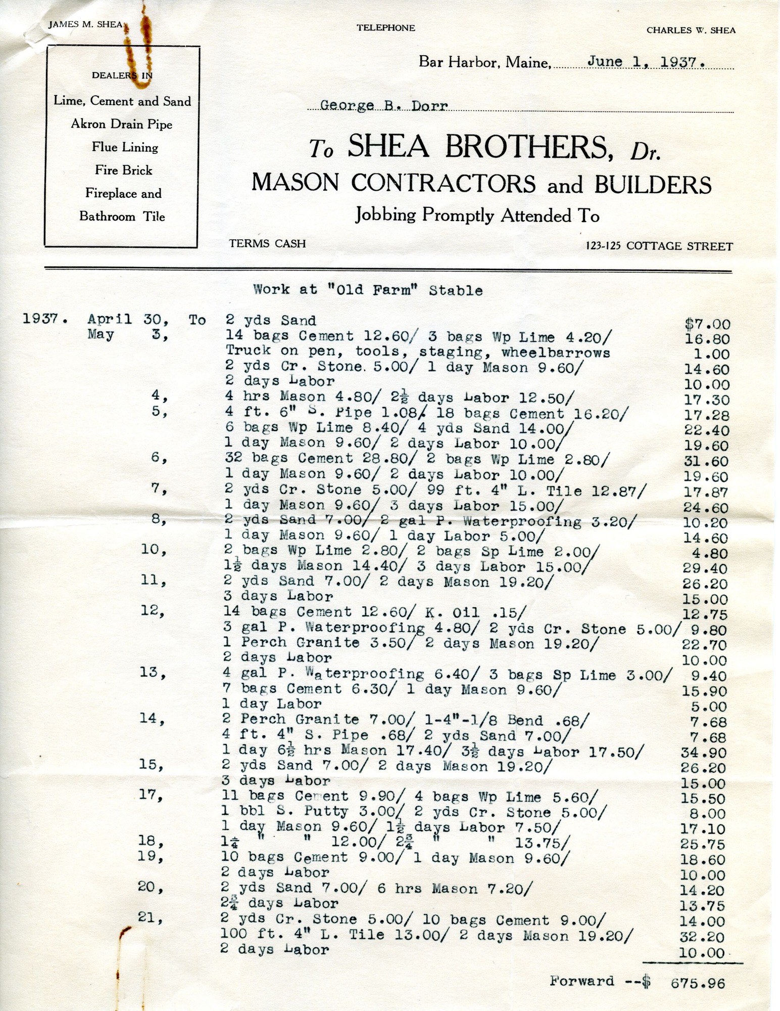 Receipt from Shea Brothers/ Mason Contractors and Builders to George B. Dorr for difference construction projects and work at Old Farm. Paid June 4, 1937. See following entries for related materials: "Receipt, Shea Brothers to Dorr, June 4, 1937 p.1.tif" to "Receipt, Shea Brothers to Dorr, June 4, 1937 p.5.tif"