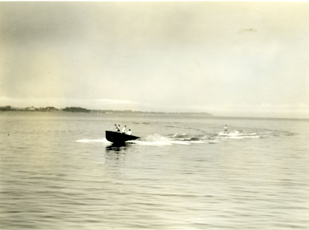 PERSON WATERSKIING BEHIND A BOAT. PEOPLE ARE IDENTIFIED IN INDEX AS E.K. MASHALL, CHILDREN, A.S. JOHNSON.