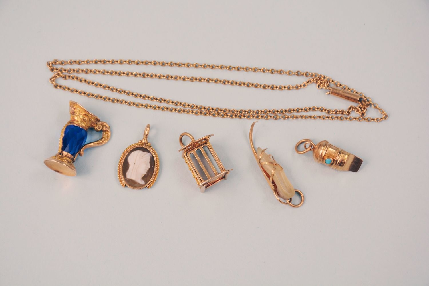 FINE GOLD CHAIN 14 INCHES LONG, STRUNG ON CHAIN 6 "CHARMS." ONE GOLD WHISTLE SET WITH SMALL TURQUOISE - WHISTLE 1/2 INCH - BLOWS. 3/4 INCH GOLD PITCHER WITH SAPPHIRE FORMING BODY OF PITCHER. SKATE OF GOLD 7/8 INCHES LONG WITH MOONSTONE SHOE HELD TO SKATE BY GOLD BANDS. GOLD CRADLE 1/2 INCH - ROCKS. WEDDING BAND 3/8 INCH DIAMETER. CAMEO - WOMAN'S HEAD 1/2 INCH - RIM OF GOLD BROKEN AT BOTTOM.TRINKETS BELONGED TO THE "PRUSSIAN WOMAN" WIFE OF SAMUEL HADLOCK, JR.