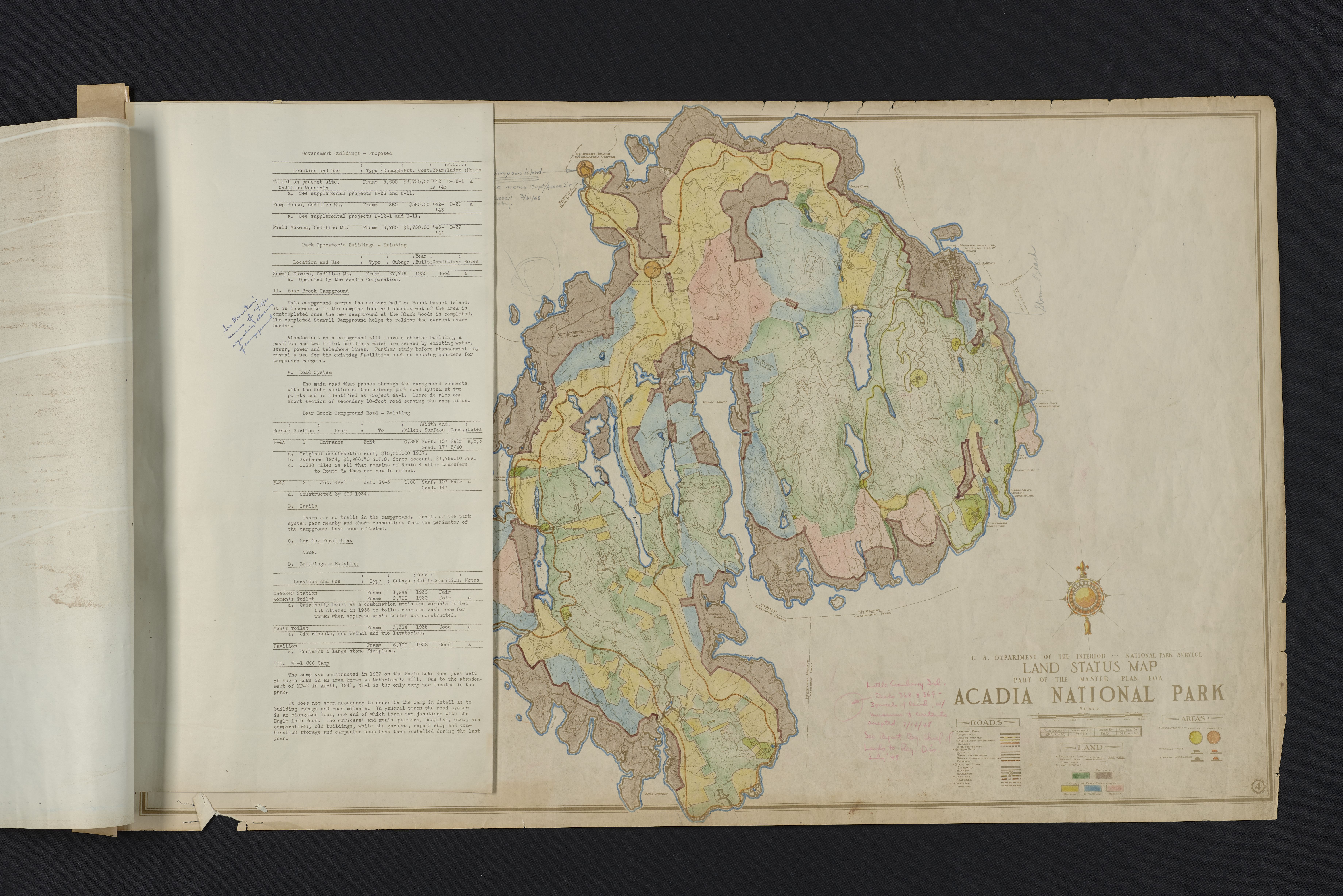 Document sheet attached to hand colored map of Mount Desert Island. Map is titled, "U.S. Department of the Interior National Park Service Land Status Map Part of the Master Plan for Acadia National Park". See entry, "U.S. Department of the Interior National Park Service Land Status Map Part of the Master Plan for Acadia National Park" for more information on the map. Document sheet describes Acadia National Park's developed Cadillac Summit Area, Bear Brook Campground, and NP-1 CCC Camp. Details include the road system, parking lot, trail system, and buildings. Details on the Cadillac Summit area include information on the Summit Tavern operated the by the Acadia Corporation. Building details include: location, use, type, cubage, year built, condition, and notes for existing and proposed buildings. Locations mentioned include: Cadillac Mountain, Bear Brook Campground, Blackwoods, Seawall Campground, Kebo, Eagle Lake, and McFarland Hill. ; Plan Number: NPAca2695