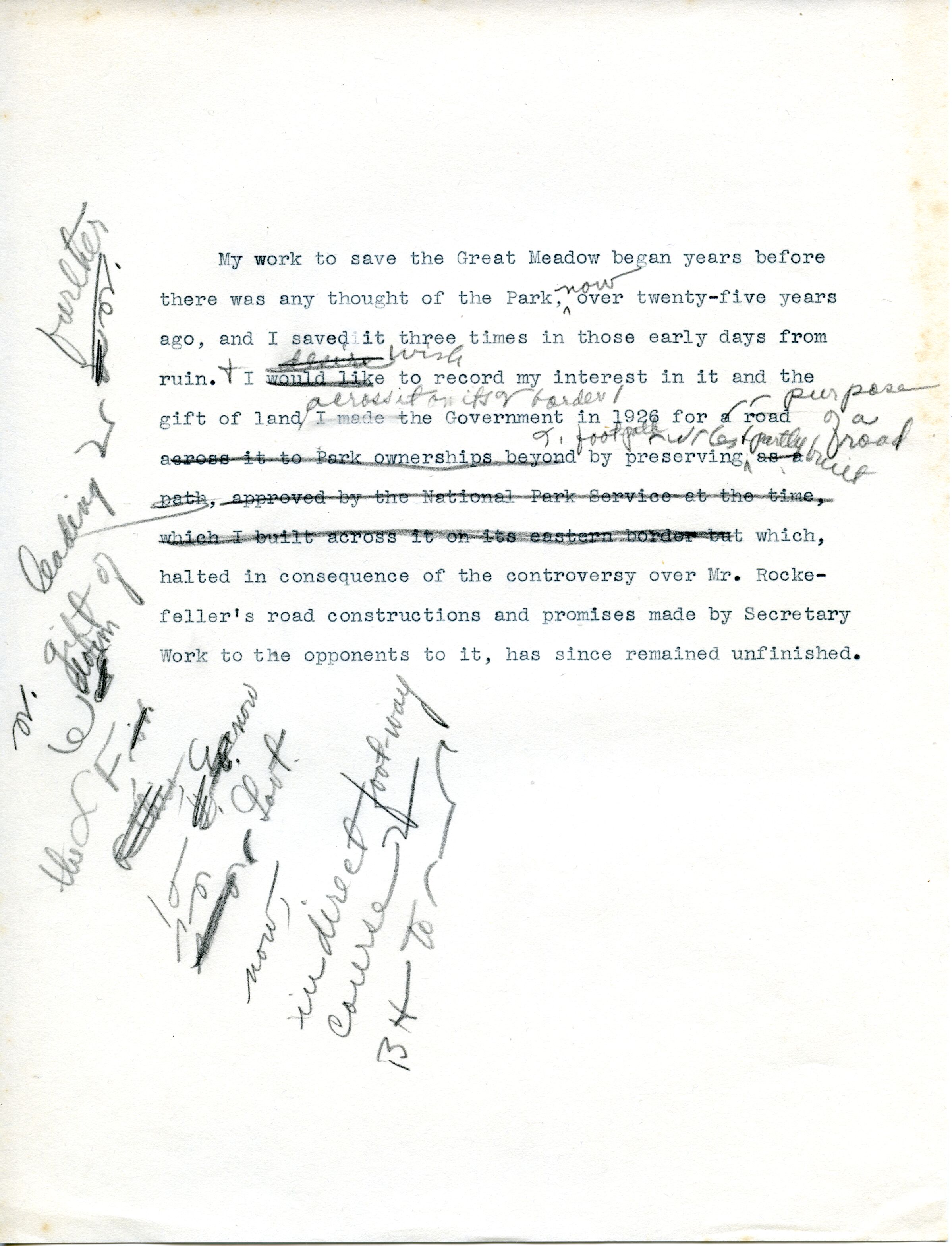 Draft correspondence with handwritten edits documenting Dorr's involvement in the donation of the Great Meadow land, road, and footpath. Includes mention of the John D. Rockefeller's carriage roads.