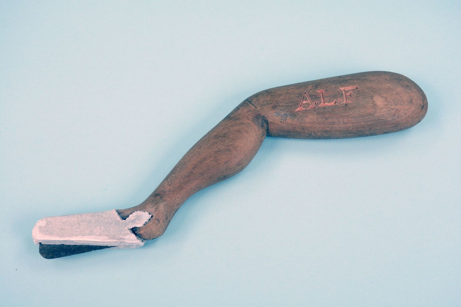 MACKEREL PLOW - HAND MADE, SHAPED LIKE A WOMAN'S LEG, METAL WHERE FOOT WOULD BE WITH KNIFE BLADE ON UNDERSIDE. INITIALS CUT IN THIGH A.L.F. WAS MADE AND OWNED BY ARTHUR LEWIS FERNALD, KNOWN AS "GARFIELD". BLADE WAS USED TO CUT FISH OPEN ALONG BACKBONE. LENGTH ABOUT 8 IN. METAL ABOUT 2 1/4 IN.