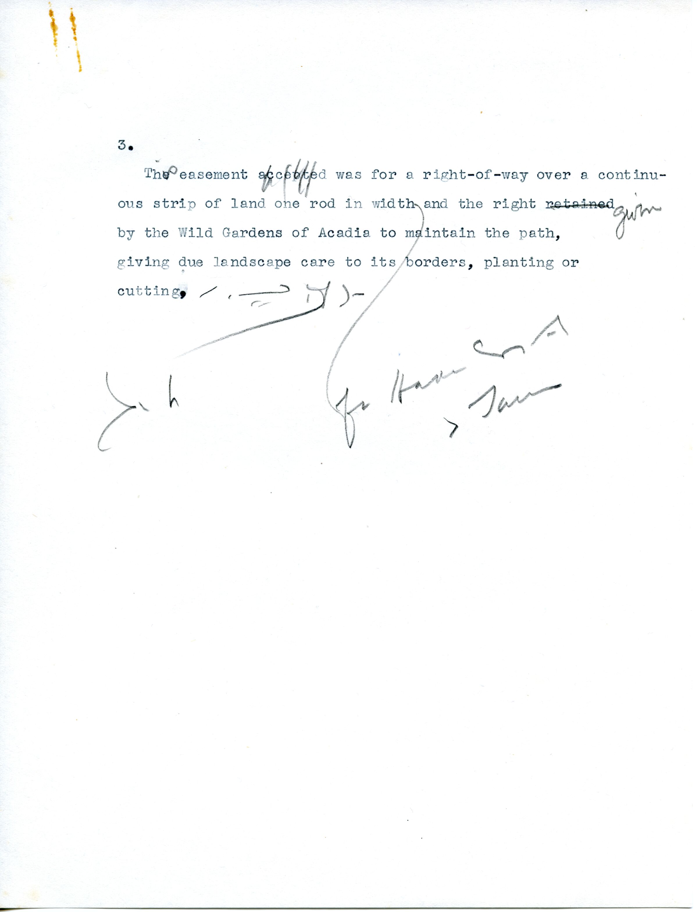 Draft correspondence with handwritten notes and edits documenting right-of-way footpath near the Wild gardens of Acadia.