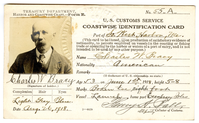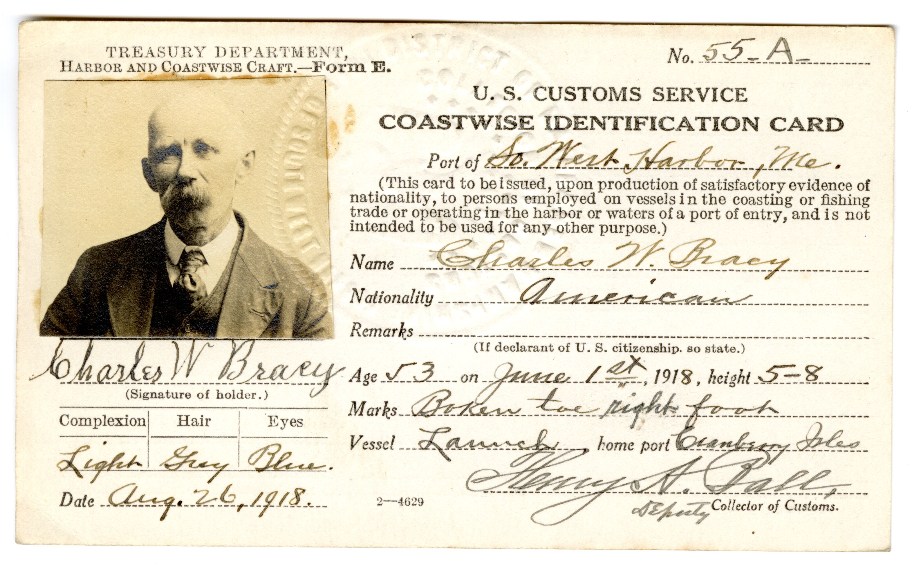 Coastwise identification card for Charles W. Bracy. Card was issued at the Port of Southwest Harbor, Maine. His age was 53 as of June 1, 1918. His ship/vessel was a Launch and its home port was Cranberry Isles, Maine. The photograph adhered to the card shows the person dressed in a suit and tie. Seal embossed on card reads, District of Maine & New Hampshire, Collector of Customs, Deputy, Port of Southwest Harbor, Maine. Nationality listed as American.