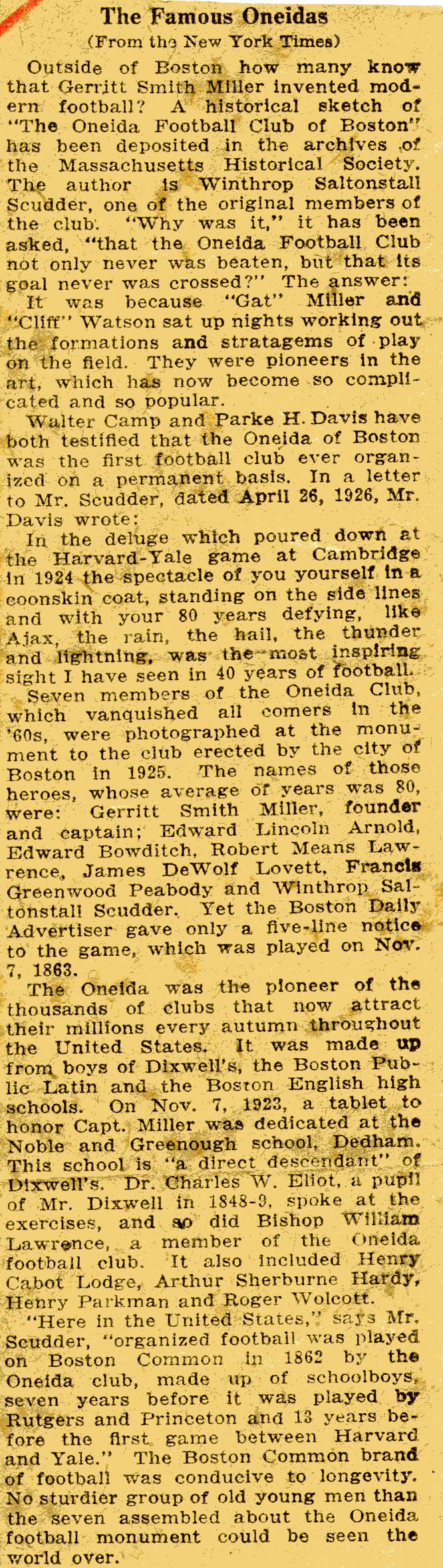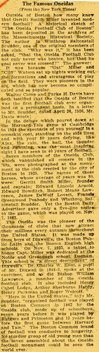 Clipping of newspaper article from New York Times titled, "The Famous Oneidas" discussing the evolution of the Oneida Football Club in Boston. See the following for related materials: "Document, The Famous Oneidas, nd p.1.tif", "Document, The Famous Oneidas, nd p.2.tif", and "Document, Oneida Monument, nd p.1.tif"