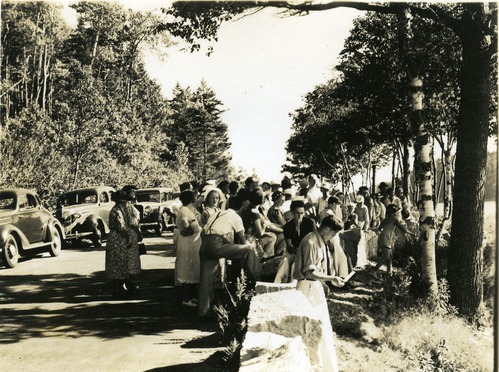 CARS LINE ALONG ROAD. PEOPLE WALKING IN ROAD AND STANDING ALONG STONE WALL.