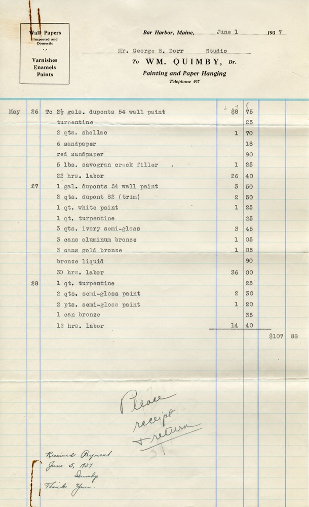 Receipt from WM. Quimby/ Painting and Paper Hanging to George B. Dorr for various painting supplies associated with his studio. Paid on June 5, 1937. See following entries for related material: "Receipt, Quimby to Dorr, June 5, 1937 p.2.tif" and "Receipt, Quimby to Dorr, June 5, 1937 p.3.tif"
