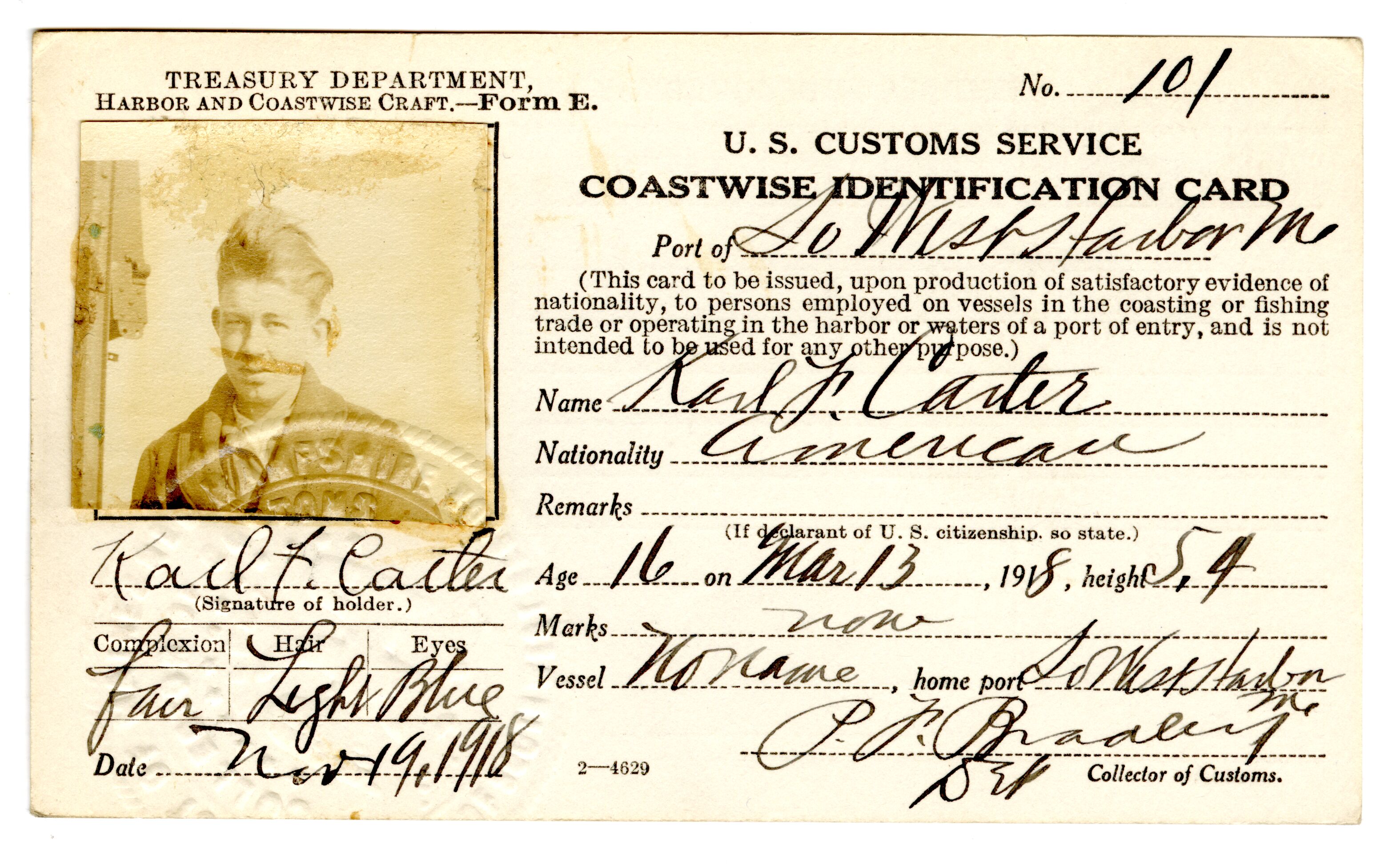 Coastwise identification card for Karl F. Carter. Card was issued at the Port of Southwest Harbor, Maine. His age was 16 as of March 13, 1918. His ship/vessel had no name and its home port was Southwest Harbor, Maine. The photograph adhered to the card shows the person dressed casually. Seal embossed on card reads, District of Maine & New Hampshire, Collector of Customs, Deputy, Port of [Port stamped off card]. Nationality listed as American.