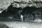 ERODED OUT AREA OF A ROCK WALL, CREATING OVER HANG. MAN, MAURICE SULLIVAN, STANDING IN THE MIDDLE OF IT.