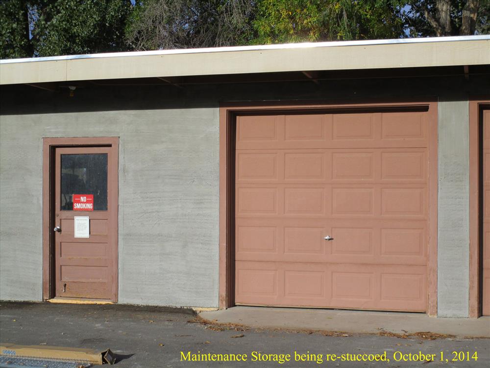 Photos show the re-stuccoing of the Cultural Resources Building (a.k.a. Kiva Trading Post), the Maintenance Storage Facility, and the Workshop