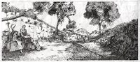 Illustration of the Hannolds' life in the Big Bend. Scene depicts Nina Hannold reading in the shade of the cottonwoods to several children.