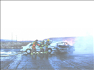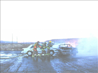 Firefighters fight vehicle fire involving two vehicles in simulation of a broadside collision during training at Mesa Verde National Park in 2001.