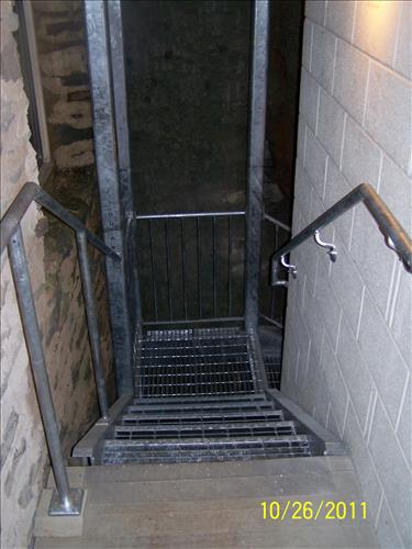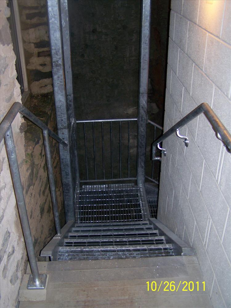 The photo images show the new metal stairway in the annex of Buildng 43, Lower Town, Harpers Ferry NHP/NPS.