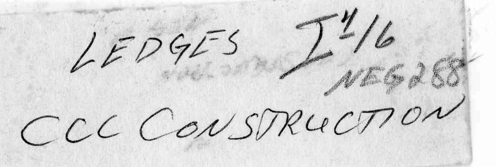 Construction of Ledges Shelter by Civilian Conservation Corps ca. 1934. See scan of writing on the back of each image for additional details. || Many of the historic structures in the Virginia Kendall unit of Cuyahoga Valley National Park were built by Civilian Conservation Corps workers during the 1930s.
