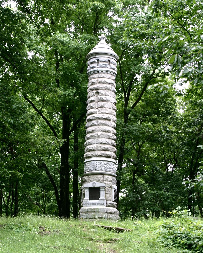 1 of 12 Mn to NJ. Only Mn to honor 1st, 2nd, 3rd, 4th, & 15th NJ regiments. Indicates general position held by Brigade Jul 2-3, 1863. Flank Markers denote specific line positions. Vista opened to Mn 1902. Located E side of N Sedgwick Av. || Mn w/ 4 flank markers. Base 7'dia. Coursed, rough-cut shaft w/ decorative banding on turret design. Excised lettering base, minature temple surrounds front bronze tablet. Bronze tablet, back, bas-reliefs sides. All 12'H. Mkrs eroded, 1'sq x 1'5".