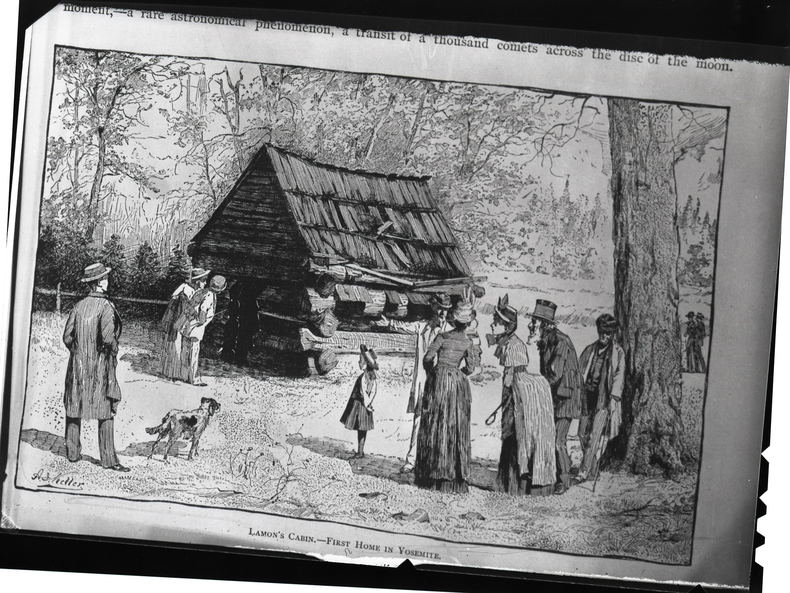 Copy Neg: Michael Dixon, July 24, 1985. Detail of L. Smaus stereo card (RL-16,441). Caption: "The First House int he Yosemite Valley, Cal." Lamon cabin.