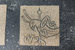 This is a close up of a part of the mosaic for the first public school, the Latin School. It depicts the grasshopper weather vane that is located on top of Faneuil Hall. The grasshopper is facing to the left and has his top legs raised like he is jumping. There is a pole shown going through his body. At the bottom left of the image is a "W" indicating that west is in that direction.