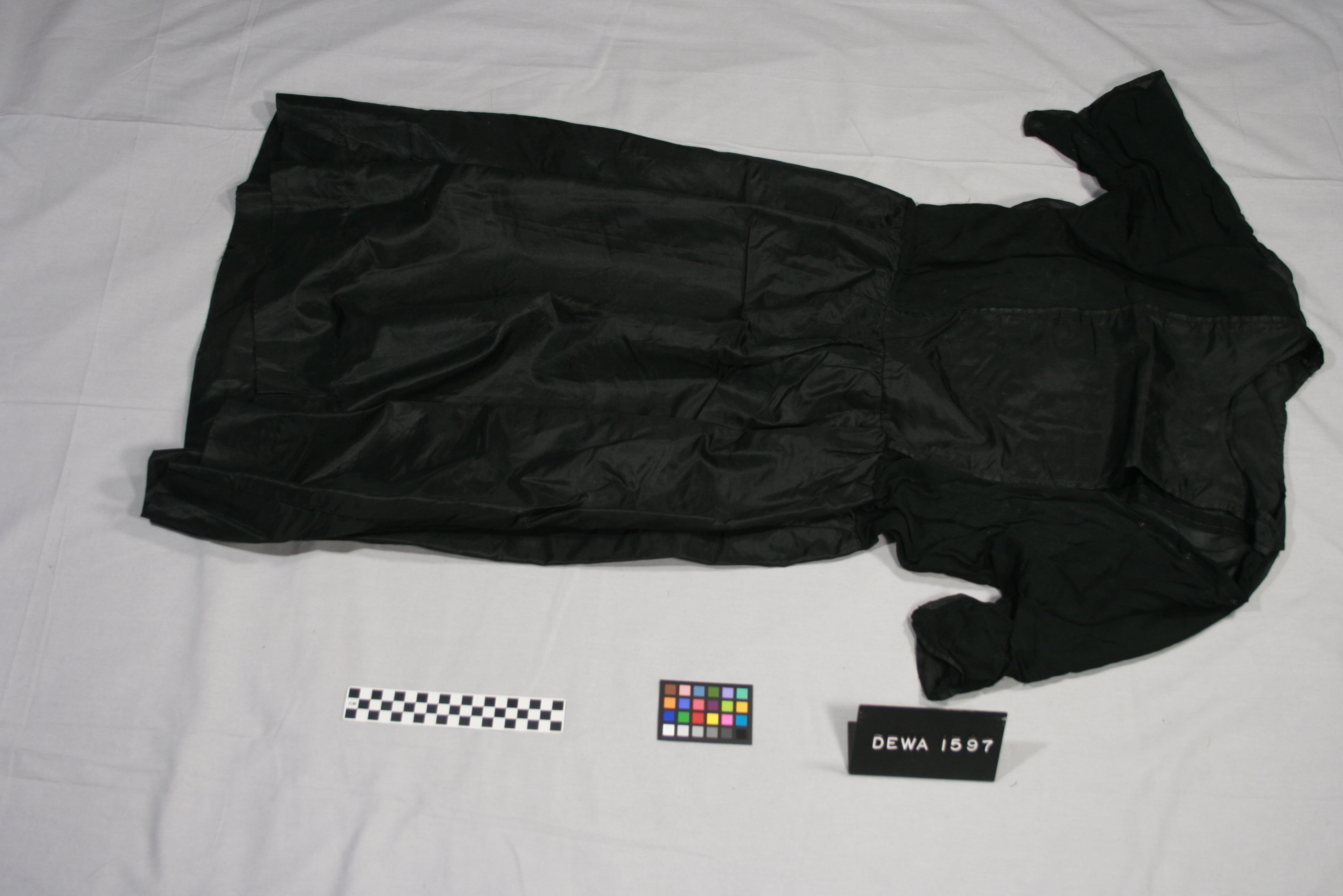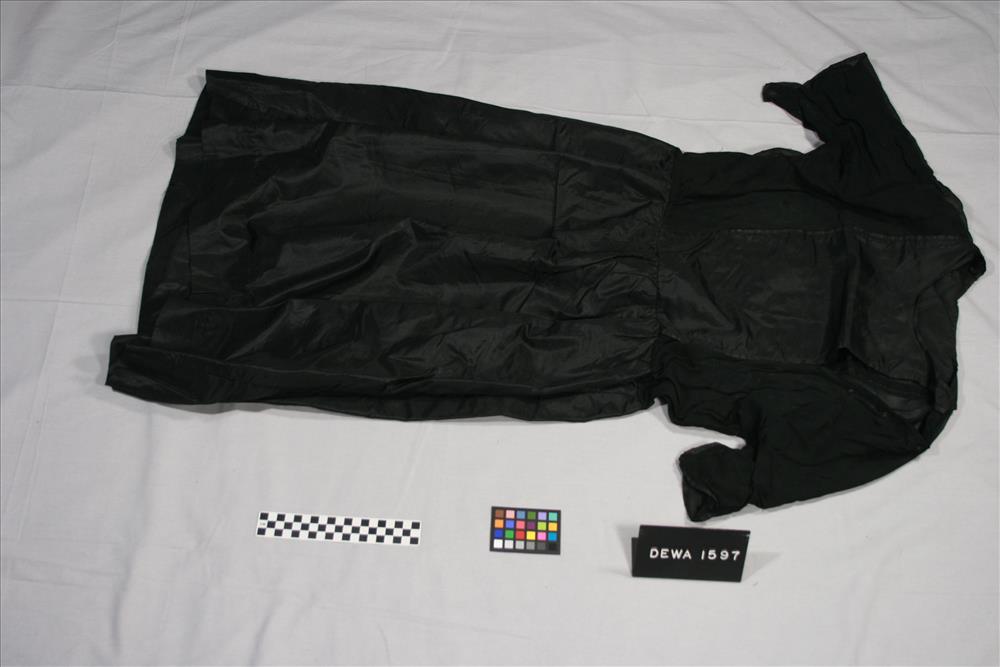 Black dress with a round neck, side inserts that form sleeves, shirred waist and side snap closing