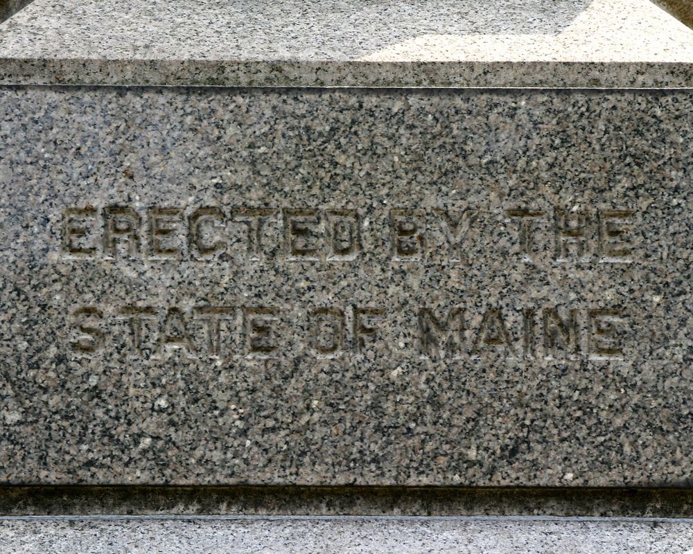 Marks position held by 4th Maine Infantry during p.m. of July 2, 1863. 1 of 15 mns in Park to Maine commands at Gettysburg. Located near entrance to Devil's Den. Position marker marks location of regiment on July 3, 1863. Located on Hancock Ave. || Mn, 2 flank markers & 1 position marker. Set on boulder. 5-sided double base, each side 6'w, 2'4" high. Shaft, each side 2'9"w, 12' high. Inscription on all sides. Flank markers, slant faced, 1'6"x1'x2'.