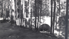 Black and white historic photo of a stone-faced bridge arching over a creek in a forest. An old fashioned car is parked next to the side of the bridge.