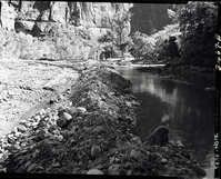 Virgin River and the rock retaining wall alongside the road at the slide area in Zion Canyon. ; ZION Museum and Archives Image 002_03013 ; ZION 13290