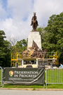 A Civil War statue with tall stone base, soldiers on the bottom and an officer on horseback on top. The statue is surrounded by scaffolding and a fence with a sign "Preservation in Progress"