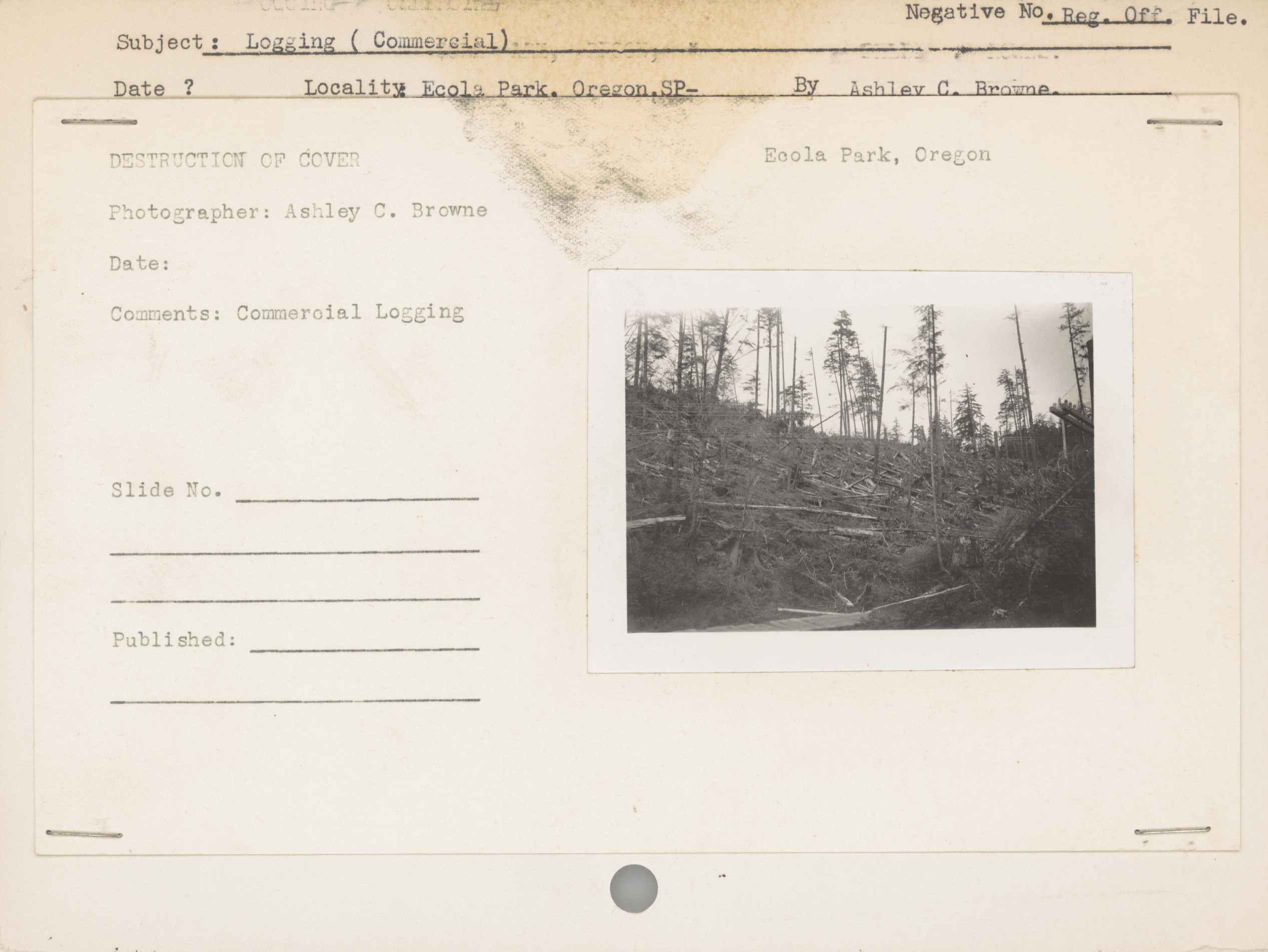 Logging (commercial) Destruction of cover. No negative on file. Locality: Ecola Park. Oregon State Park.