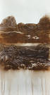 A texture-rich monochrome image printed on paper using woodblock printing. In the foreground, water flows through a boulder-covered canyon floor, creating pools and rapids. In the middleground, a grassy field blends into a shrub-covered hillside. A rocky cliff face is seen above the hill. Behind the field and cliff, a large sandstone peak stands above surrounding vegetation. In the background, tall flat-topped cliffs stand before a white sky.