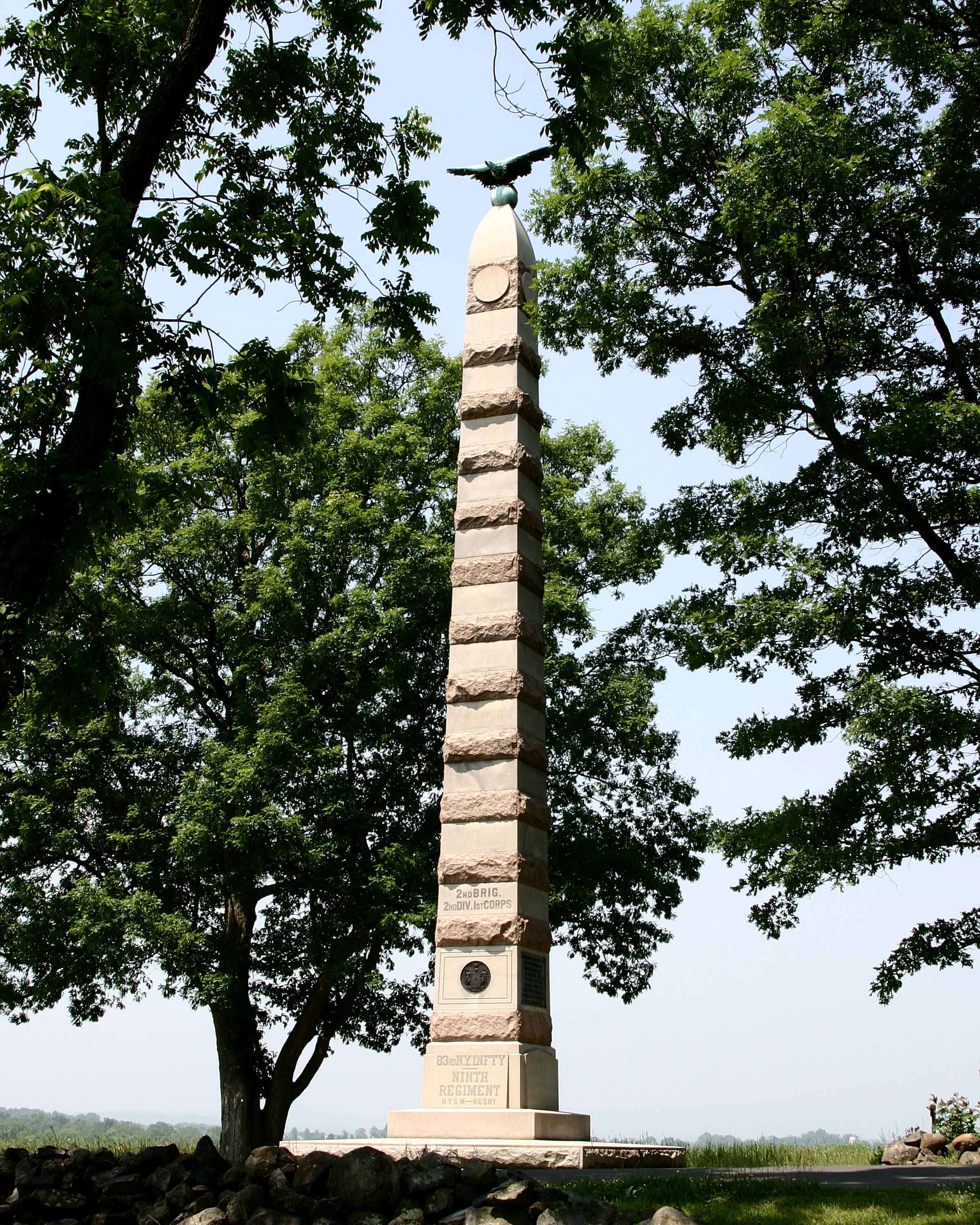 Marks position held by 83 New York Infantry during afternoon of July 1, 1863 when it aided in repulse of Iverson's CS Brigade. 1 of 90 Mns in Park honoring NY commands at Gettsyburg. Located on W side Doubleday Ave, S of intersection w/Robinson Ave. || Obelisk, 51' high, w/ alter. courses of rough & smooth stone. Topped w/ bronze eagle, 5'8" spread, rests on base, 15'x15'. 2 bronze tablets, N & S, 2'11"x2'4" & 2 tondos, 6'dia. both w/ raised letters. Flank markers have apex tops.