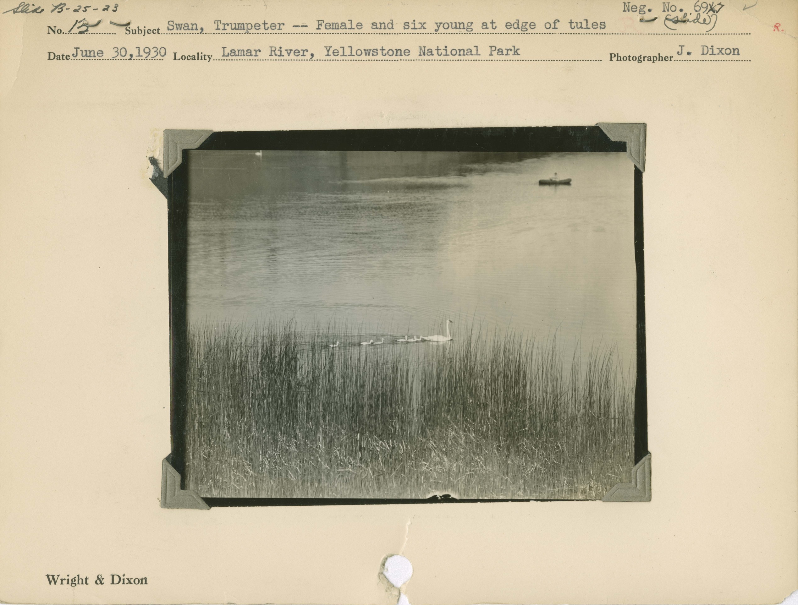 Swan, Trumpeter -- Female and six young at edge of tules. Locality: Lamar River, Yellowstone National Park. Negative #: 697-1