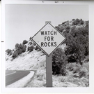 Road sign reading 'Watch for Rocks' in Kolob Canyon. ; ZION Museum and Archives Image 007.01.01-13of73 ; ZION 15933
