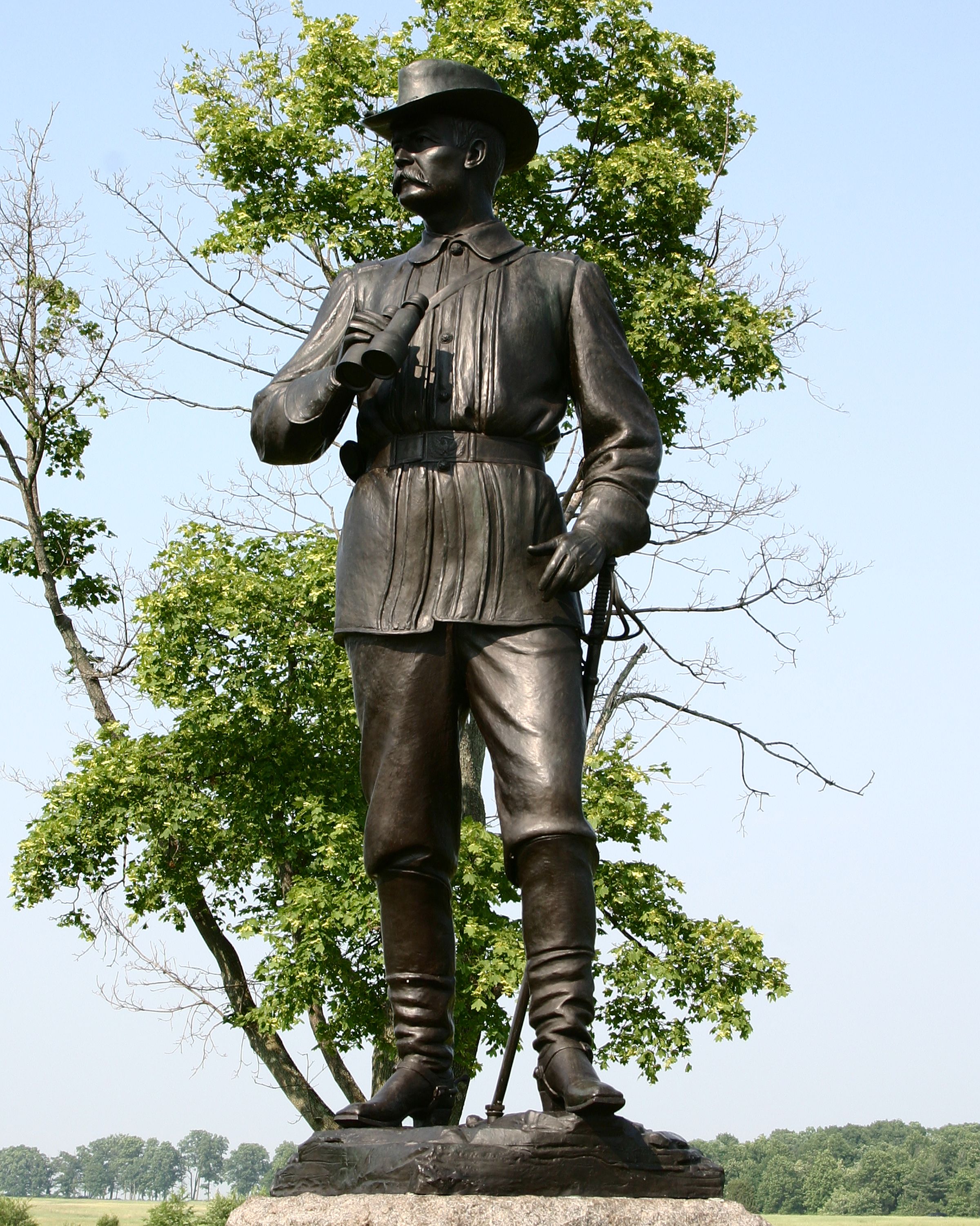 Marks spot where Buford stood on a.m. of July 1, 1863 & ordered Calef to open fire with his battery. Located on McPherson Farm between Chambersburg Pike & RR line. Incorps 4 cannons of Calef's battery & base, including tube that fired opening shot. || Mn & 4 cannons. Statue, 9' high on rough hewn pedestal, 3'6" sq, 4'6" high. Base 5'sq 2' thick. Inscription on S of base. Bronze inscription tablets on N & S of pedistal. At 4 corners 3' ordinace rifle tubes mounted on slabs.