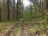 A dirt road in a wooded area.