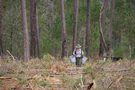 A park ranger wearing 2 seedling bags, walking through an open forest