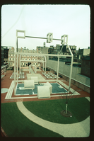 Franklin Court. Low aerial view. Looking northeast from behind ghost house, towards Market Street.