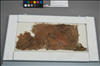 Plain cotton weave with scattered dye/pigment in no recognizable pattern. DYED RED, L 9, W 3 1/2 IN. TWO PIECES IN WACC ACCESSION 133. A THIRD PIECE SENT TO WACC AS OTR, SEE WACC ACC 787 AND DEACC 1993.003. THE PHOTO WHILE ON EXHIBIT MAKES THE TEXTILE APPEAR TO HAVE BLACK SPOTCHES ON IT. THIS WAS FROM THE GLARE OF BLACK TEXT ON THE PLEXIGLASS CASE. PREVIOUSLY ON LIFE ON THE LEDGES EXHIBIT.