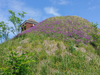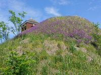 Outside. Blue sky at top with wispy white clouds. A mound in slightly off center covered with grasses and purple wildflowers. On the left side slope some tall plants are growing and there is the top of a red brick building with white trim and a peaked grey roof.