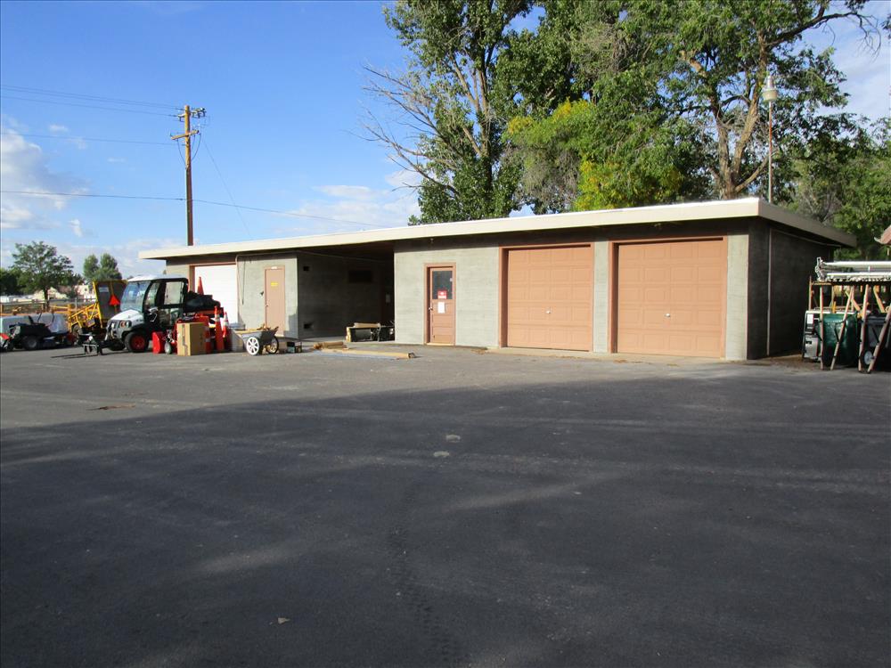 Photos show the re-stuccoing of the Cultural Resources Building (a.k.a. Kiva Trading Post), the Maintenance Storage Facility, and the Workshop