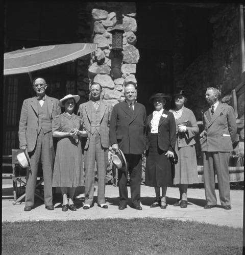 Mr. & Mrs. Herbert Hoover and party at the Ahwahnee Hotel. The group included: Mr. & Mrs. Frank S. Hoag (Published of the Pueblo Star Journal); Mr. & Mrs. W.V. Codding (Pres. R.W. Savings & Bldg. Assoc. of Pueblo) and Mr. & Mrs. Walter T. Mathis.