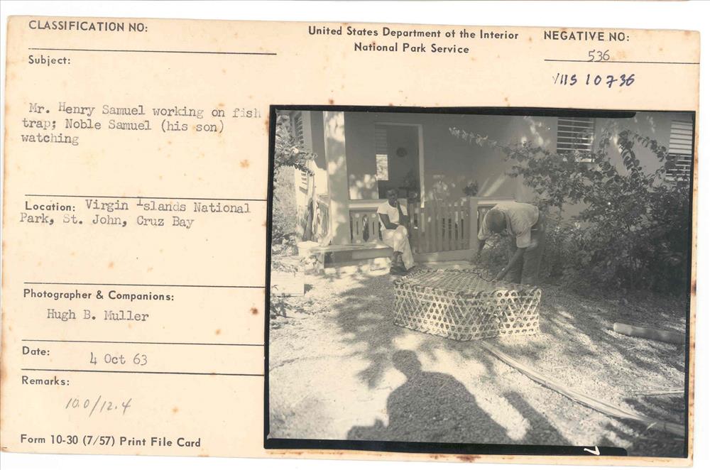Mr. Henry Samuel demonstrating how to construct a fishtrap made of Teyer Palm, native to the Virgin Islands. His son is watching in image catalogue No. 10736