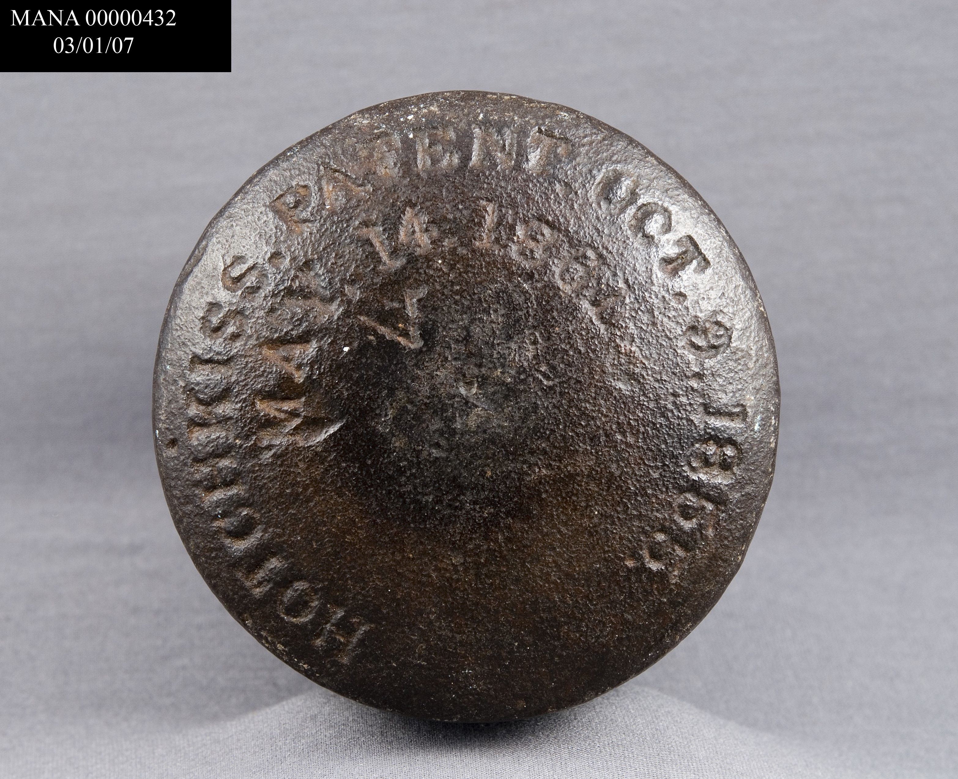 Detail of base showing date of manufacture and patent