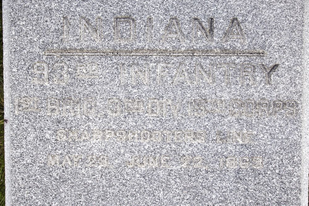 30" x 45" x 40" high, rectangular, hammer-finished gray granite block, inscribed on its slightly slanted top with INDIANA and unit designation. Edges of top are beveled.