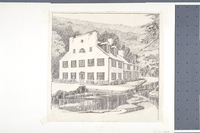 Historical pencil drawing of Great Falls Tavern (Crommelin House).