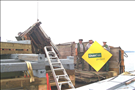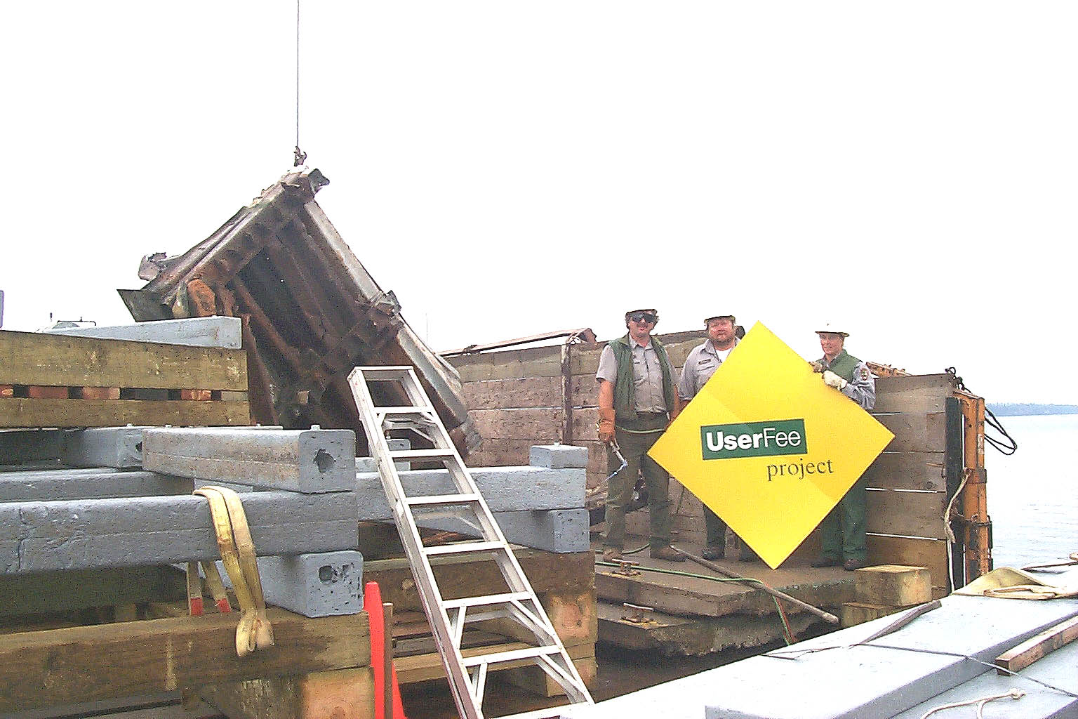 Dock construction using barge at Tookers Island, Isle Royale, 1999