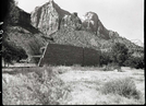 Standard Stations, Inc. service station located in the park with Watchman Peak in background. Location is near the current Nature Center (South Campground). ; ZION Museum and Archives Image 005_09_007 ; ZION 13442