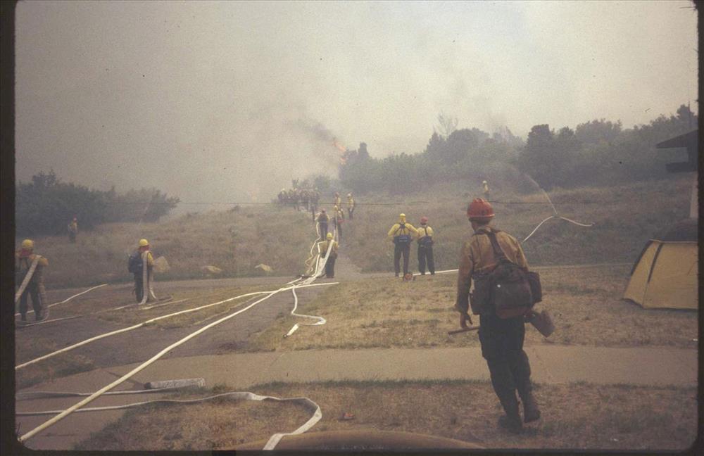 Firefighters provide structural protection to commercial buildings during the Bircher fire, Mesa Verde National Park, July 2000