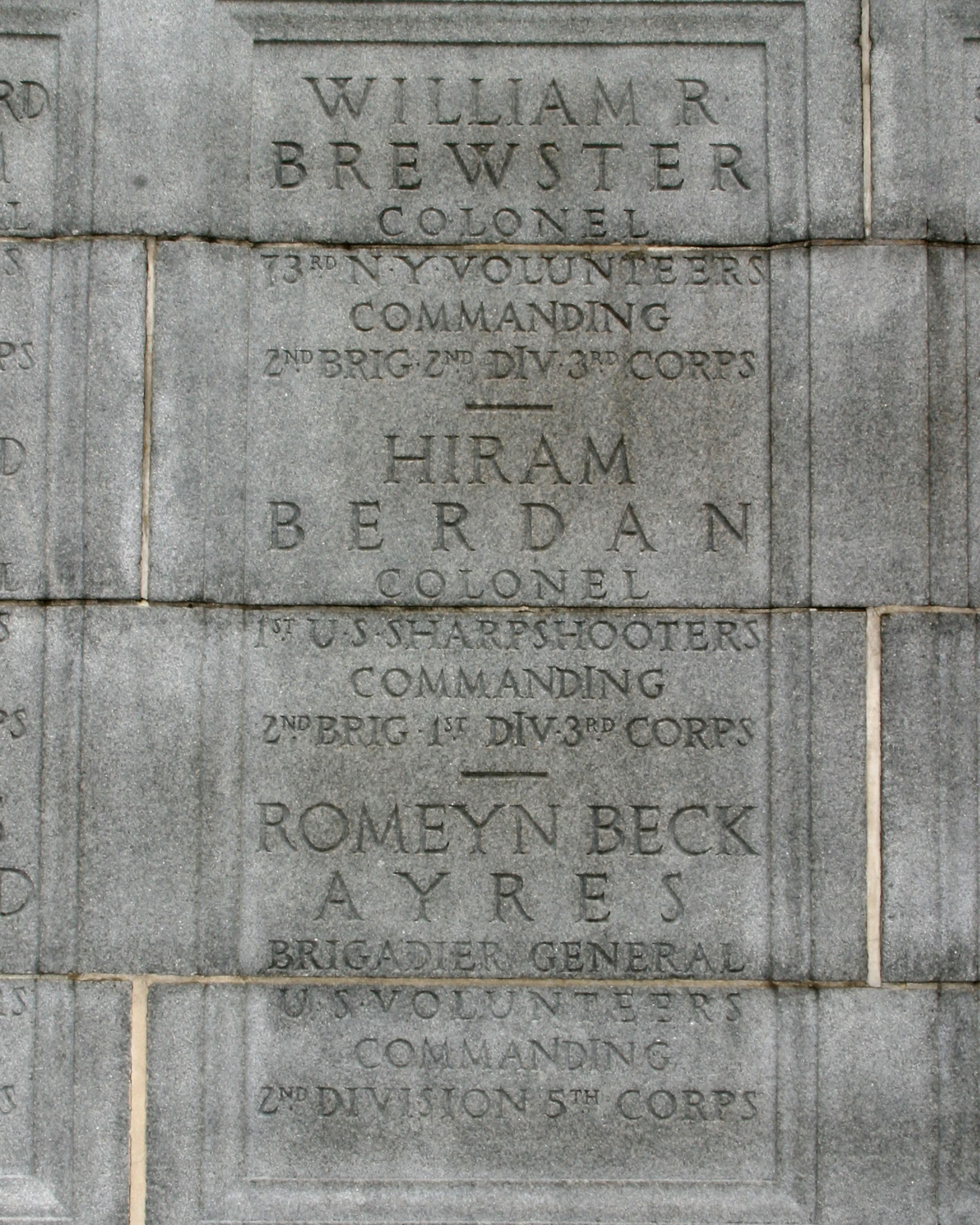 1 of 2 New York State Monuments. Erected to commerate NY commanders not listed elsewhere that fought at Gettysburg. Located E side South Hancock Avenue. || Mn, semi-circular 42'L x 24'D x 21' H. Central projecting node of base, shaft incised inscriptions, excised coat-of-arms, topped by spread wing eagle. Incised commander names in circular wall portions. Granite walk to Mn 8'x 14'w/2risers 8."