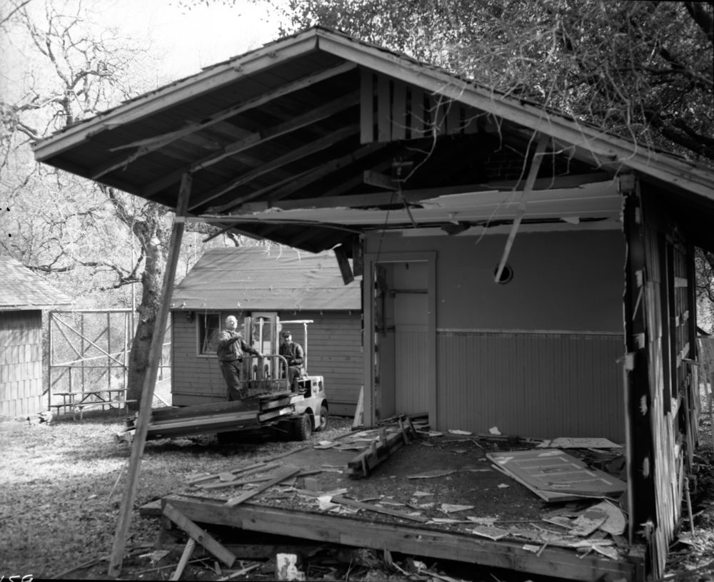 Buildings and Utilities, Removal of Cabins "Whiskey Row". Rollie Cowle driving fork lift.