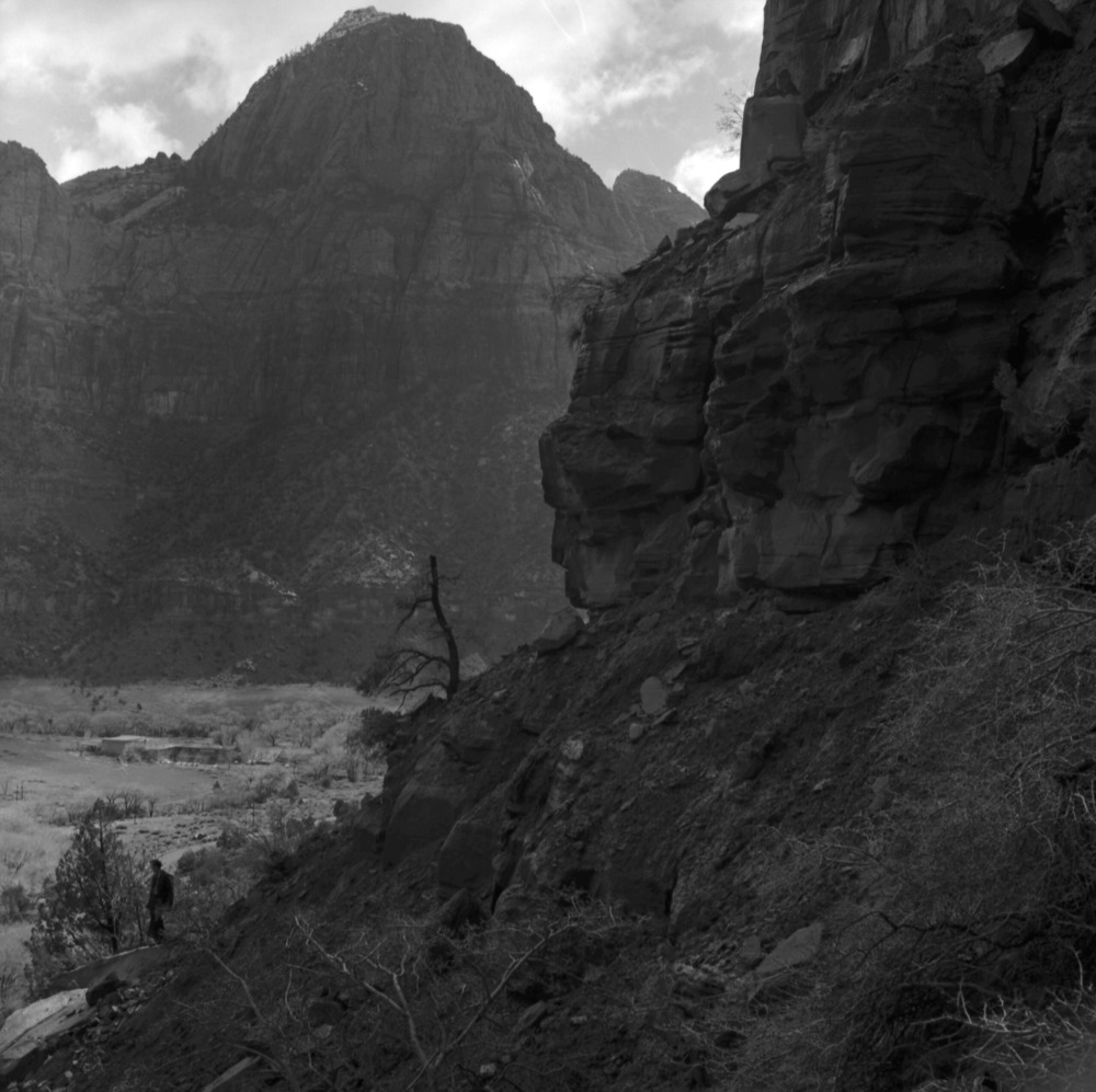 B&W negative of rock slide near Temple of Sinawava. [Scratches, pits]